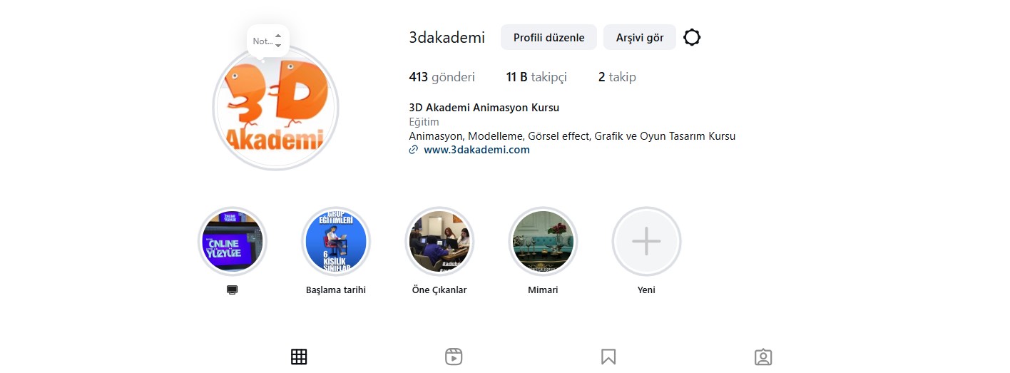 2006 yılından bu yana İstanbul’un kalbinde, Şişli’de hizmet veren 3D Akademi, animasyon ve tasarım alanında Türkiye’nin önde gelen eğitim kurumlarından biridir. Hem yeni başlayanlar hem de profesyoneller için kapsamlı eğitim programları sunan 3D Akademi, 2D ve 3D tasarım, mimari programlar, grafik tasarım, hareketli grafikler, video montaj, oyun programlama, 3D karakter modelleme, animasyon, çizgi film gibi birçok alanda uzmanlaşmış eğitimler vermektedir. Bugüne kadar 6 bini aşkın mezun veren kurum, sektördeki başarısını her geçen gün daha da pekiştirmektedir.